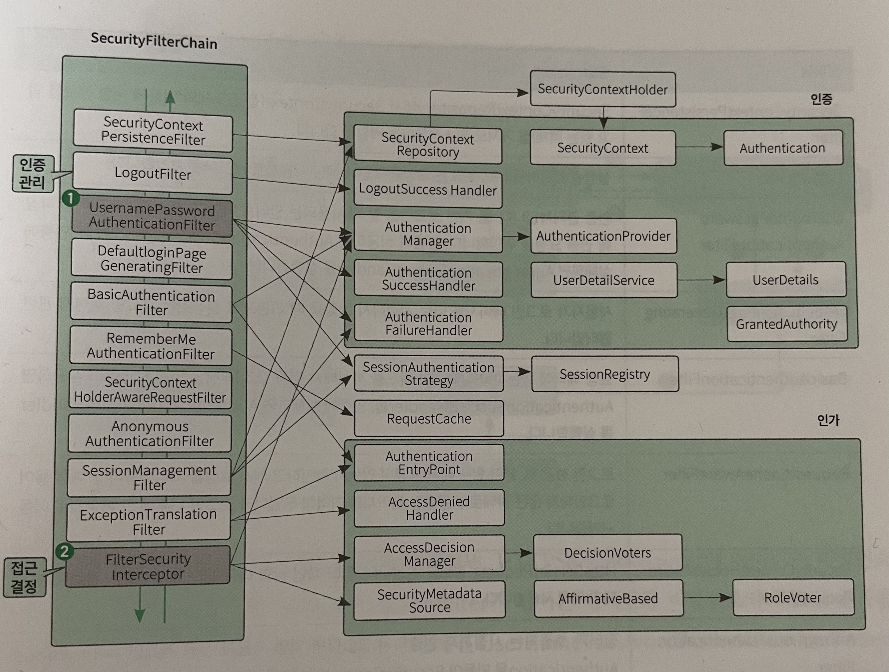스프링 시큐리티는 다양한 필터들로 나누어져 있고, 각 필터에서 인증, 인가와 관련된 작업을 처리한다.